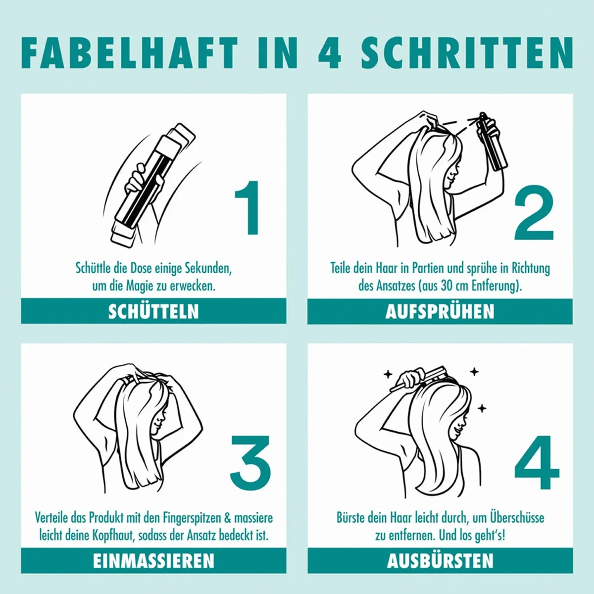 Ausbürsten: Bürste die Haare gründlich aus, damit sich das Produkt gleichmäßig verteilt und keine sichtbaren Rückstände verbleiben.