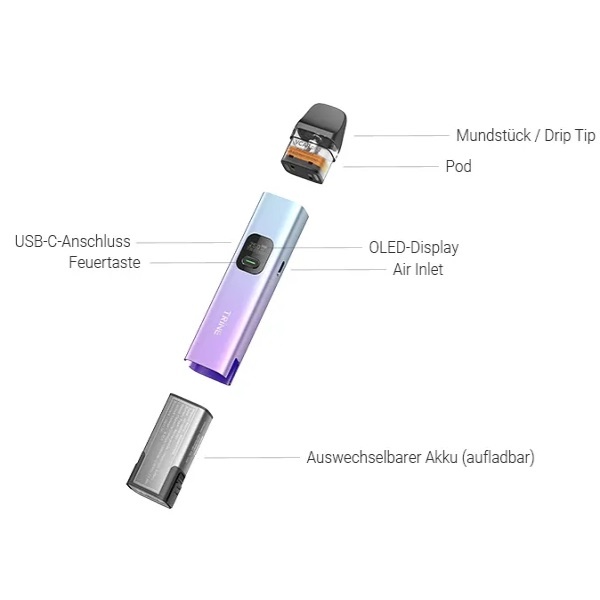 Zum Lieferumfang des Kits gehören zwei Pods mit integrierten Coils. Der 0.8 Ohm VCap Pod ist für das moderate Dampfen vom Mund zur Lunge ausgelegt, während der VCap Pod mit der 0.6 Ohm Coil neben dem Dampfen im MTL Bereich auch restriktive Lungenzüge unterstützt. Im Watt Modus arbeitet die Trine E-Zigarette mit regelbarer Leistung. Aktiviert wird das Gerät optional auf Zug am Mundstück oder über die Feuertaste, mit welcher auch die Einstellungen vorgenommen werden. Ein integriertes OLED Display informiert Sie über Betriebsparameter wie die momentane Ausgangsleistung oder den Ladestand des Akkus. Eine Besonderheit der Innokin Trine ist ihr modularer Aufbau, bei dem der Verdampfer, das Control Panel und der Akku wechselbar sind. Dank der EcoDrain™ Funktion kann der wechselbare, wiederaufladbare Akku am Ende seiner Nutzungsdauer vor der endgültigen Entsorgung vollständig entladen und entsorgt werden.