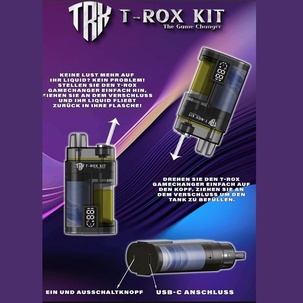 Es richtet sich dabei aufgrund seiner besonderen Eigenschaften insbesondere an die MTL- und RDL-Dampfer (Mouth to Lung/ restriktives Direct Lung). Was das T-Rox Kit so besonders macht ist, dass es sowohl mit der sich im Lieferumfang befindlichen 10 ml Leerflasche als auch dank eines Adapters sämtliche andere 10ml Liquid Bottles kombiniert werden kann, dies erinnert doch stark an klassische Squonker Mods. Der reine Tank des T-Rox Kits verfügt dabei über ein Füllvolumen von 6 ml. Geht das Liquid zur Neige kannst du das T-Rox Kit ganz einfach auf den Kopf drehen, einen Mechanismus betätigen und schon fließt das Liquid von der Liquid-Bottle in den Tank. Seine Power von maximal 15 Watt erzielt das T-Rox Kit im Übrigen von einem integrierten, 1000 mAh starken Akku, der Dich sicher über den Tag bringt und bei Bedarf blitzschnell wieder aufgeladen ist.