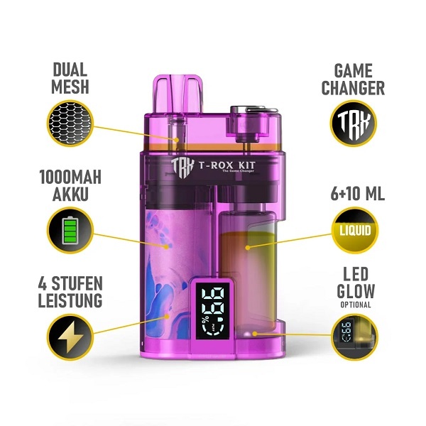 VoVan präsentiert mit dem T-Rox Kit einen innovativen Game Changer in der Welt der Pod Systeme. Schon das Design des T-Rox Kits ist ein absoluter Eyecatcher. Die Verarbeitung ist selbstverständlich absolut überzeugend und bei den verarbeiteten Materialien haben die Entwickler wert auf eine überzeugende Qualität gelegt. Das T-Rox Kit eignet sich als idealer Alltagsbegleiter, denn aufgrund seiner kompakten Größe, seiner Formgebung und Oberflächenbeschaffenheit liegt es sicher und perfekt in der Hand und passt in jede Tasche.