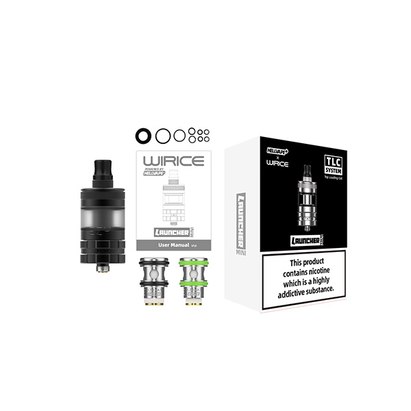 Mit seinen 23 mm Durchmesser und einer Höhe von 55,85 mm und eine Gewicht von 55 g macht der aus SUS304er Edelstahl und Borosilikatglas gefertigte Wirice Launcher Mini auf einer Vielzahl an Akkuträgern ein super Figur. Seine Optik und Haptik ist hierbei sehr modern und alle Bedienelemente sind angenehm griffig gestaltet. Der Launcher Mini bietet Platz für 3 ml Liquid, das über das komfortable Top Fill schnell und sauber in den Tank gefüllt werden kann. Dieser Tank wurde von Wirice und Hellvape für ein reines und hervorragendes MTL Dampferlebnis konzipiert, das die Herzen aller Backendampfer schneller schlagen lässt.